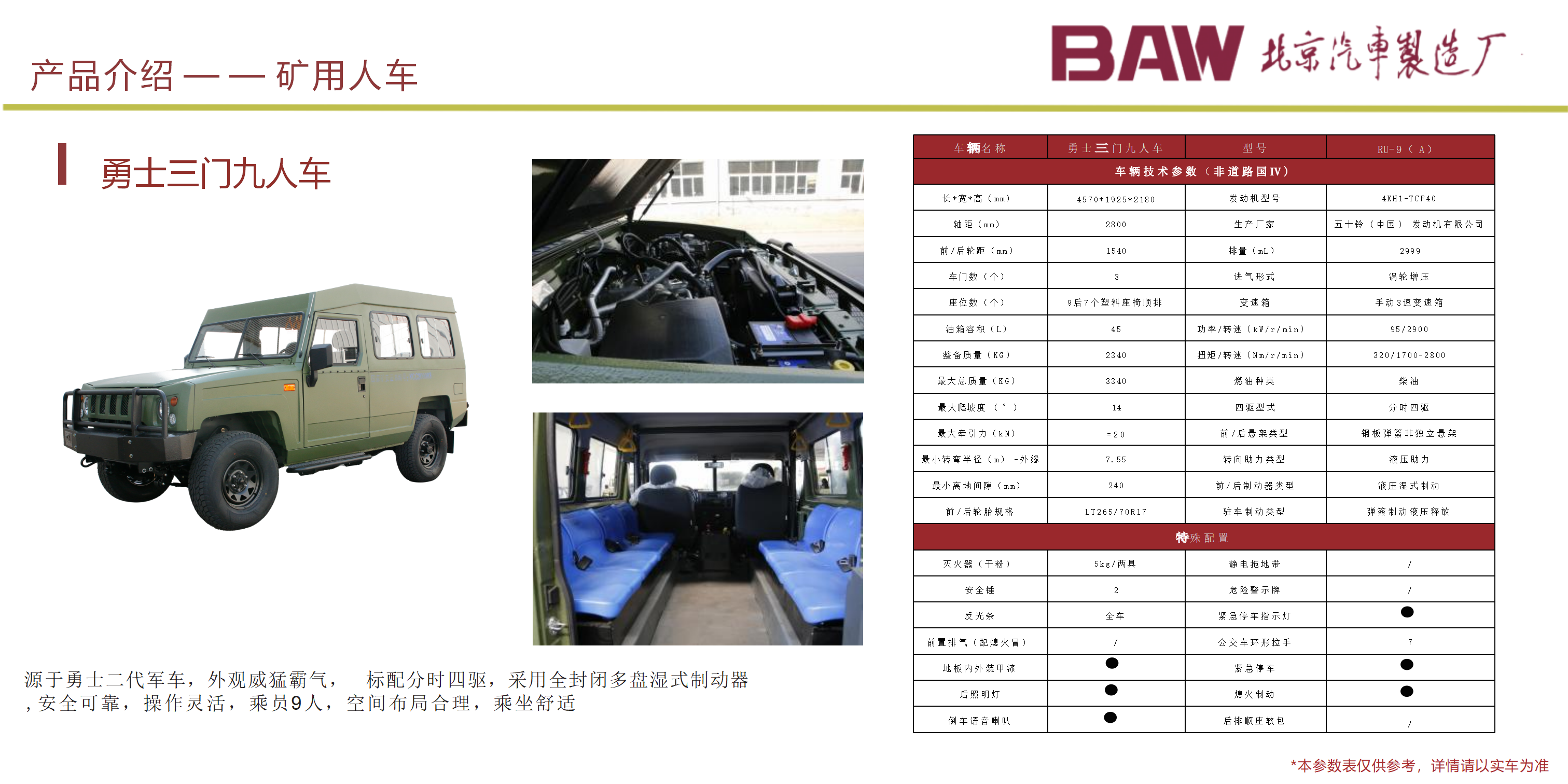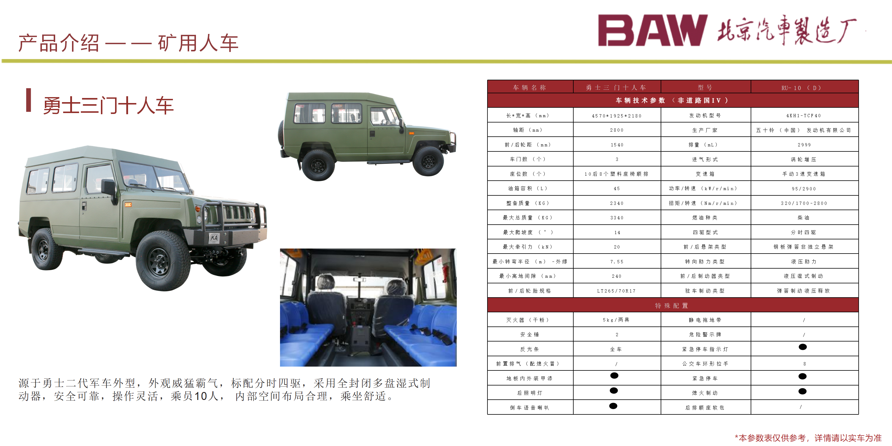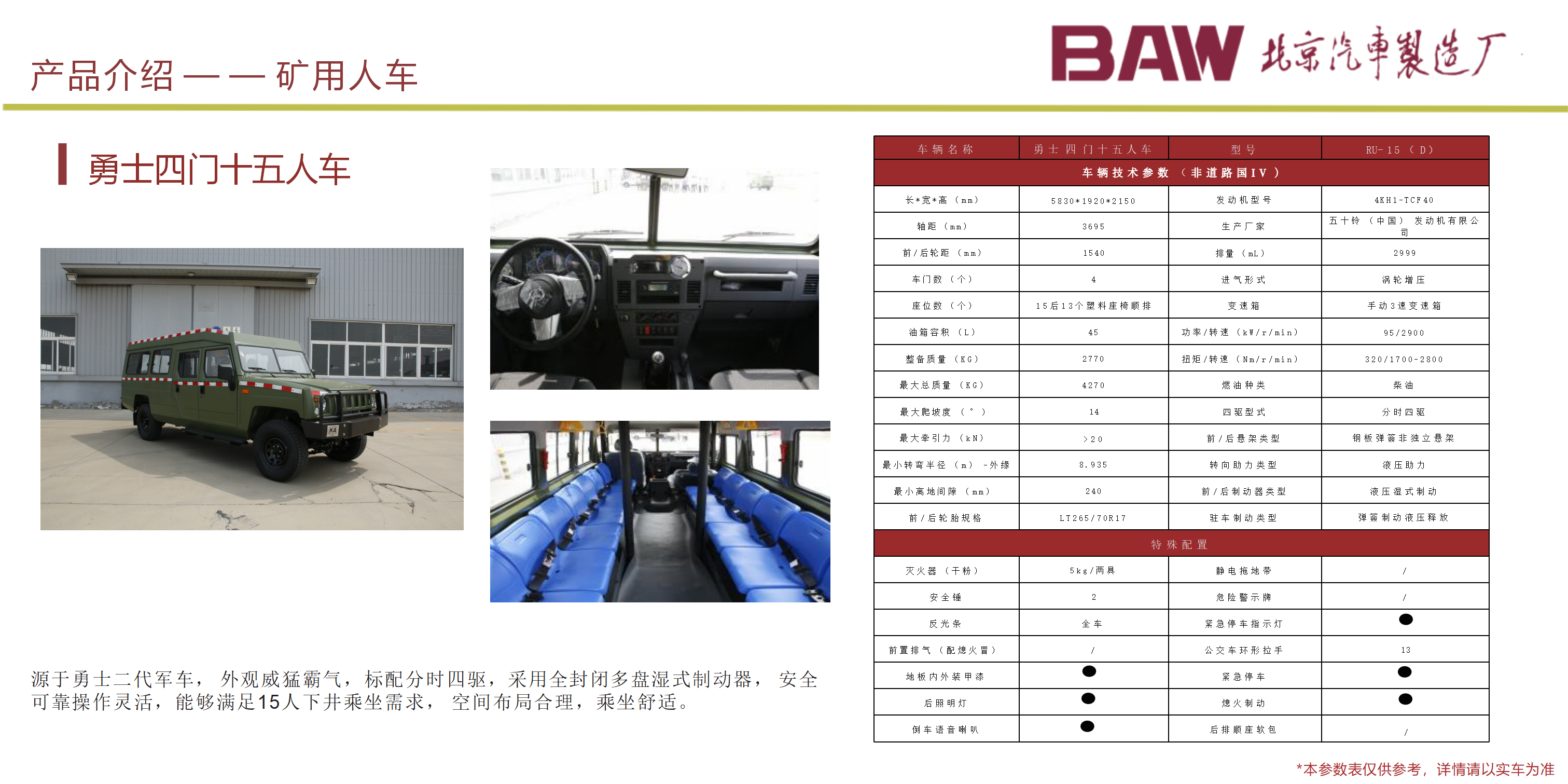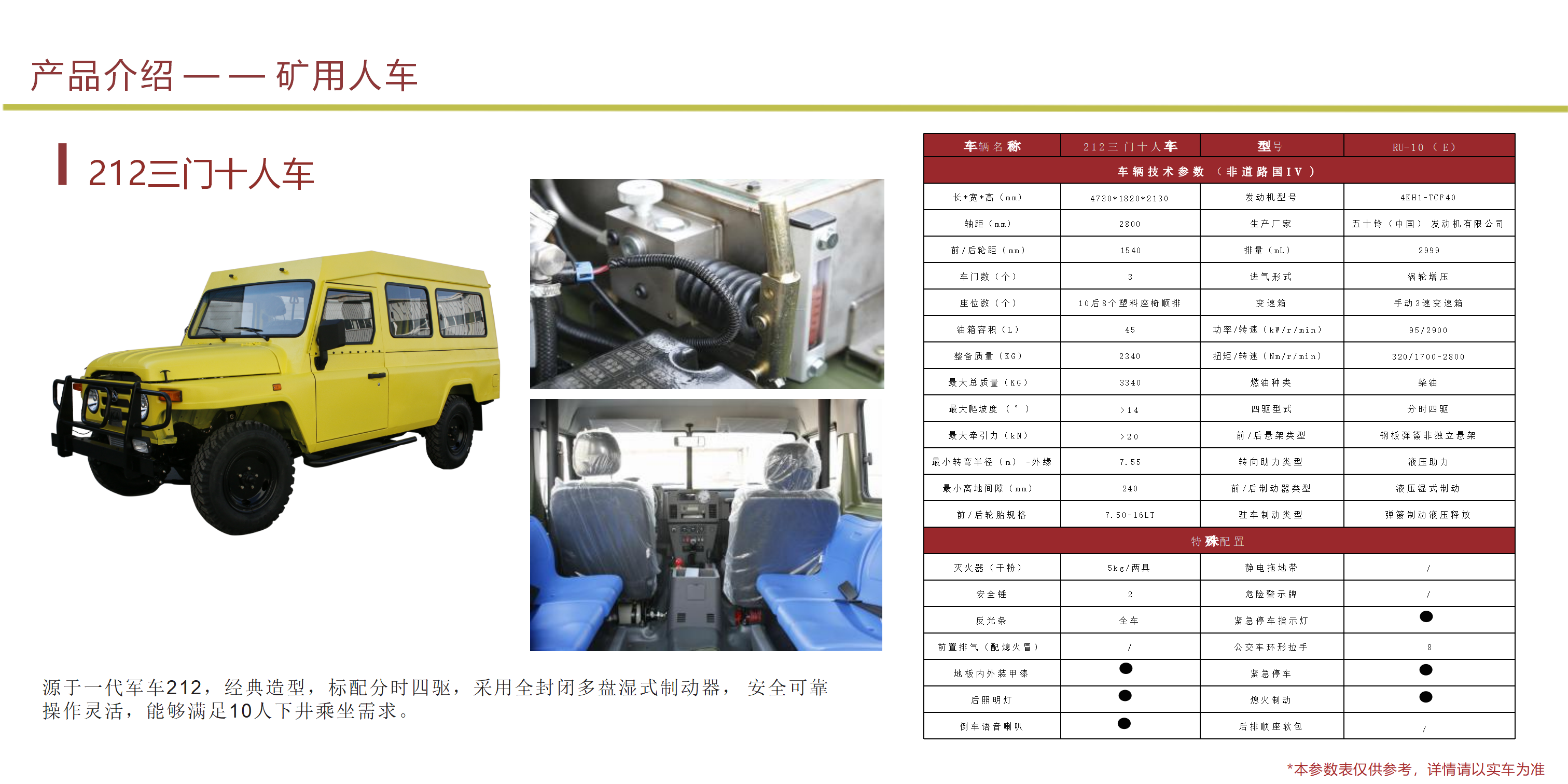 礦安系列車型均符合國家安全法律法規要求,具備礦安認證文件,已開發及即將開發的車型有10、15、19人運人車輛及材料車、炸藥車等。 配備國三江鈴、玉動及國四慶鈴發動機
