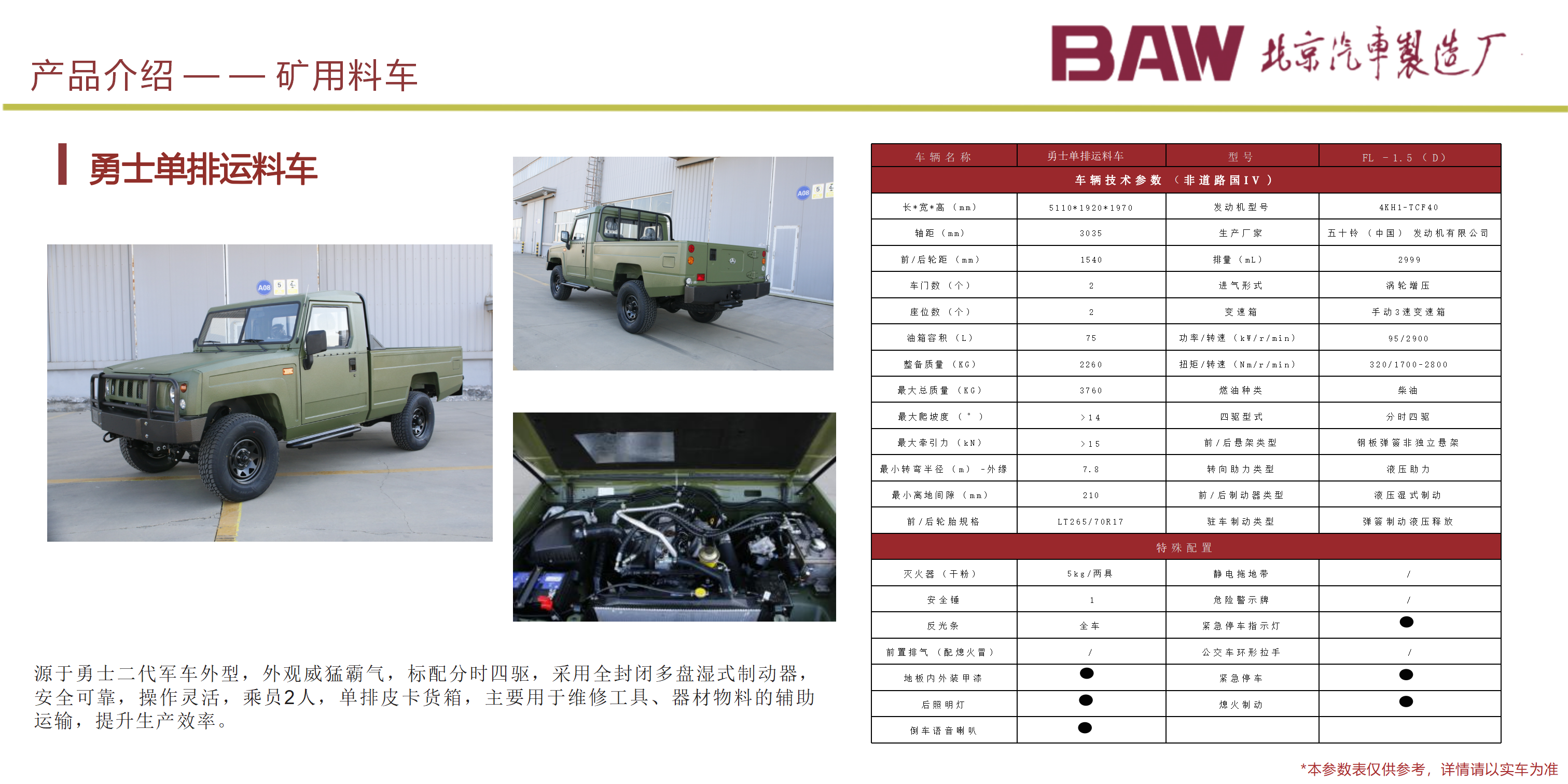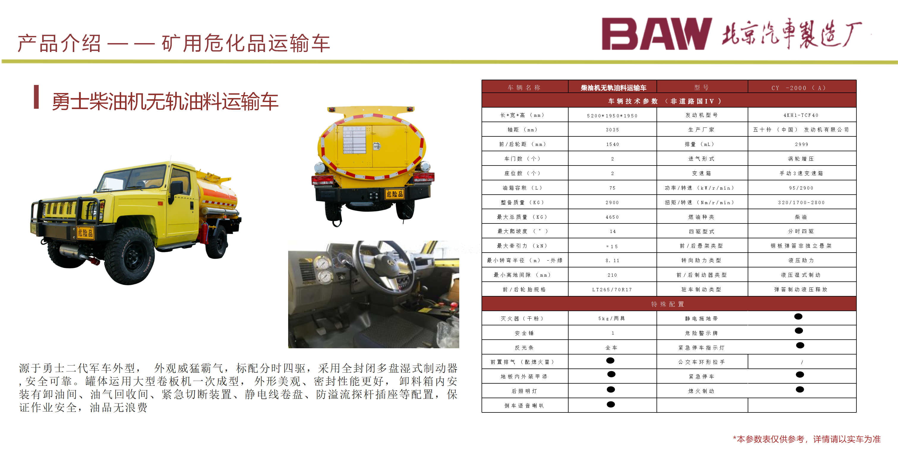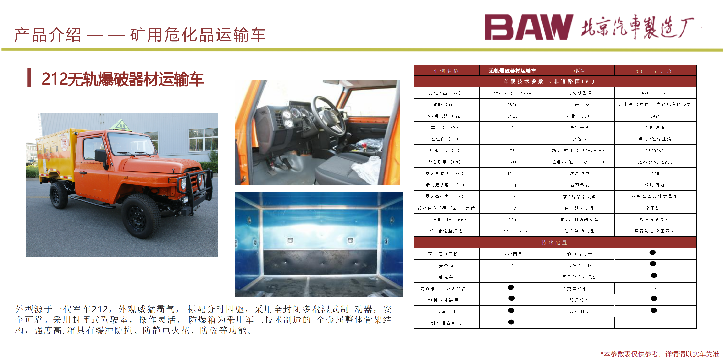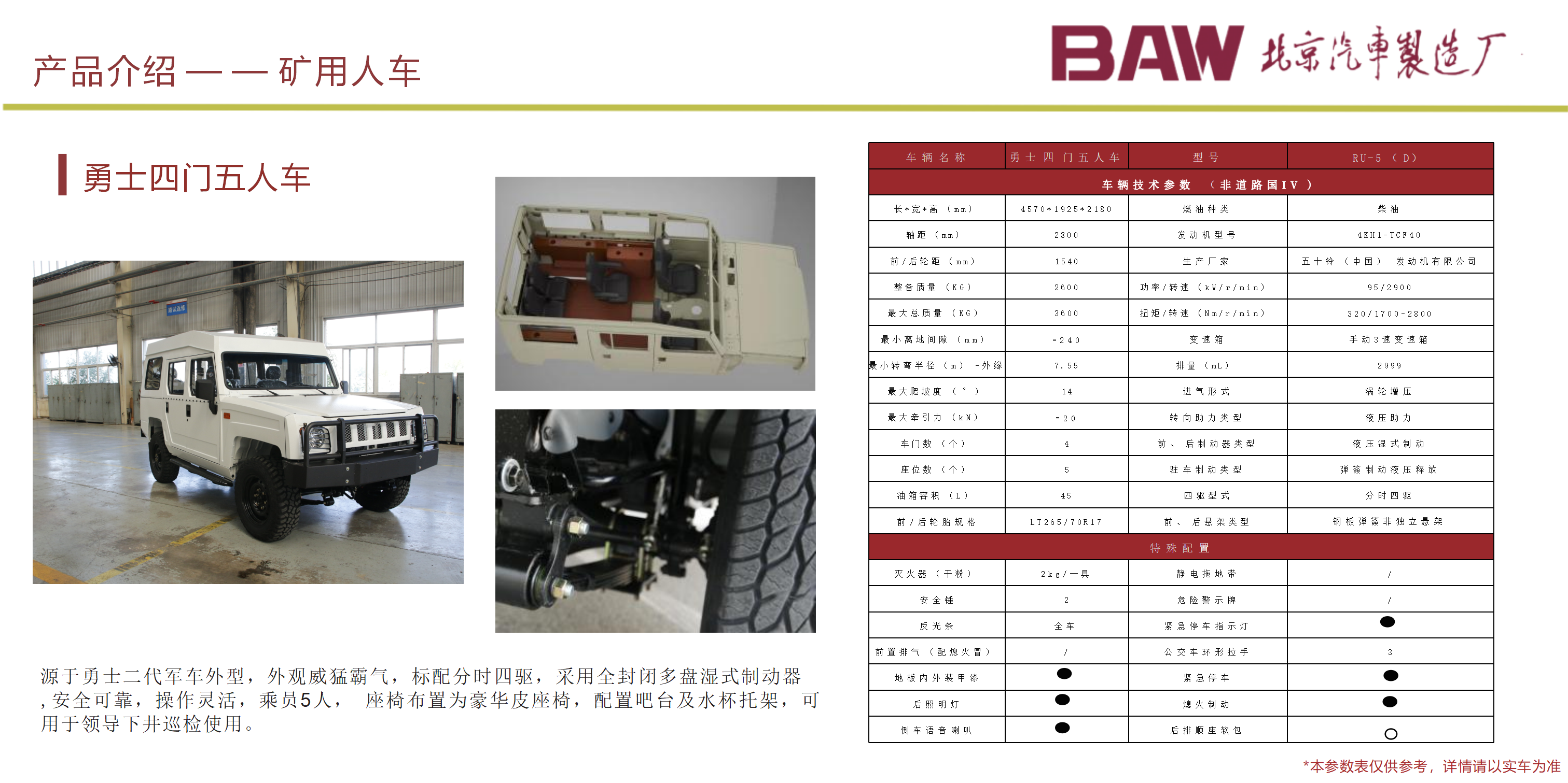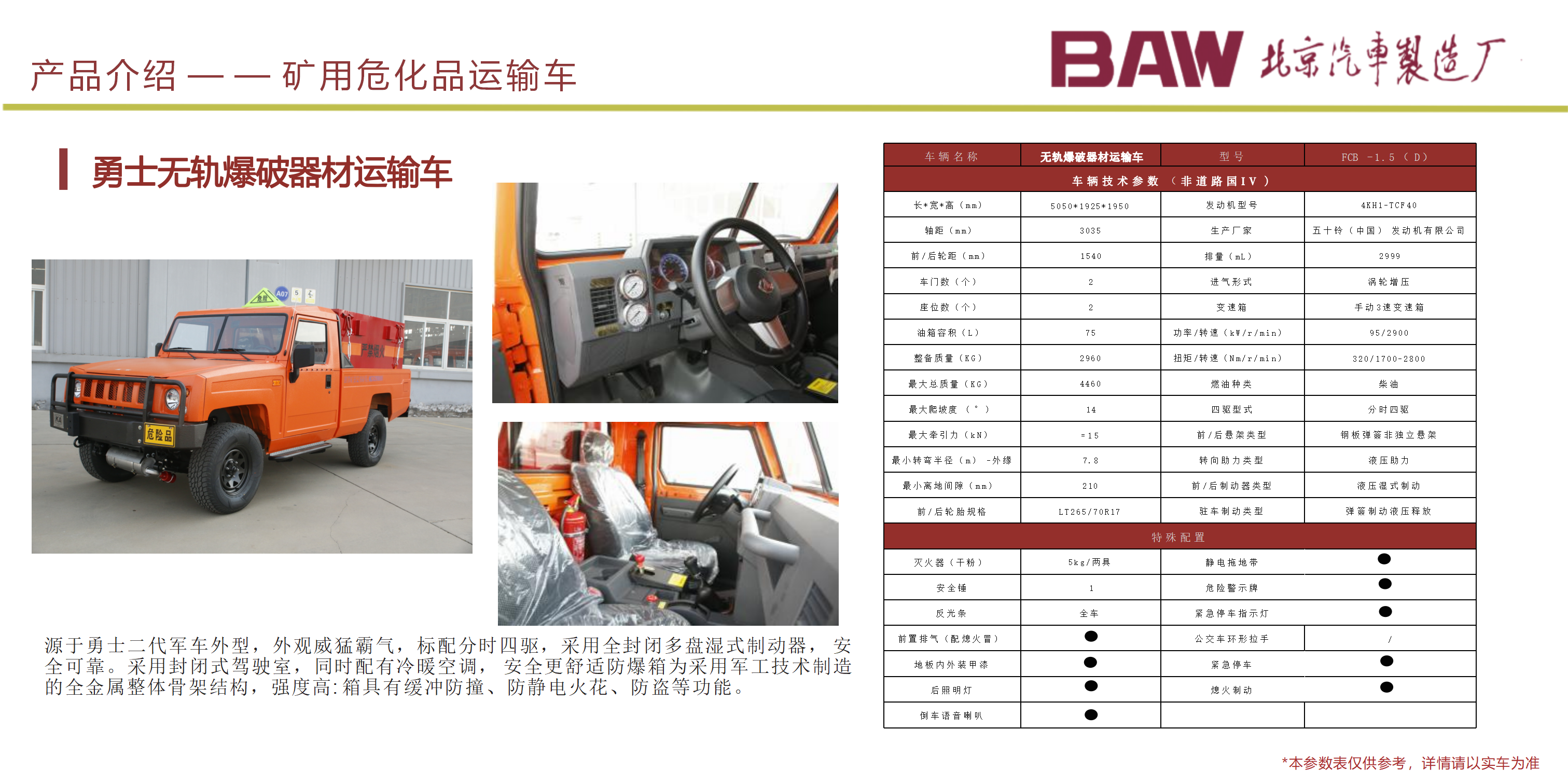 礦安系列車型均符合國家安全法律法規要求,具備礦安認證文件,已開發及即將開發的車型有10、15、19人運人車輛及材料車、炸藥車等。 配備國三江鈴、玉動及國四慶鈴發動機
