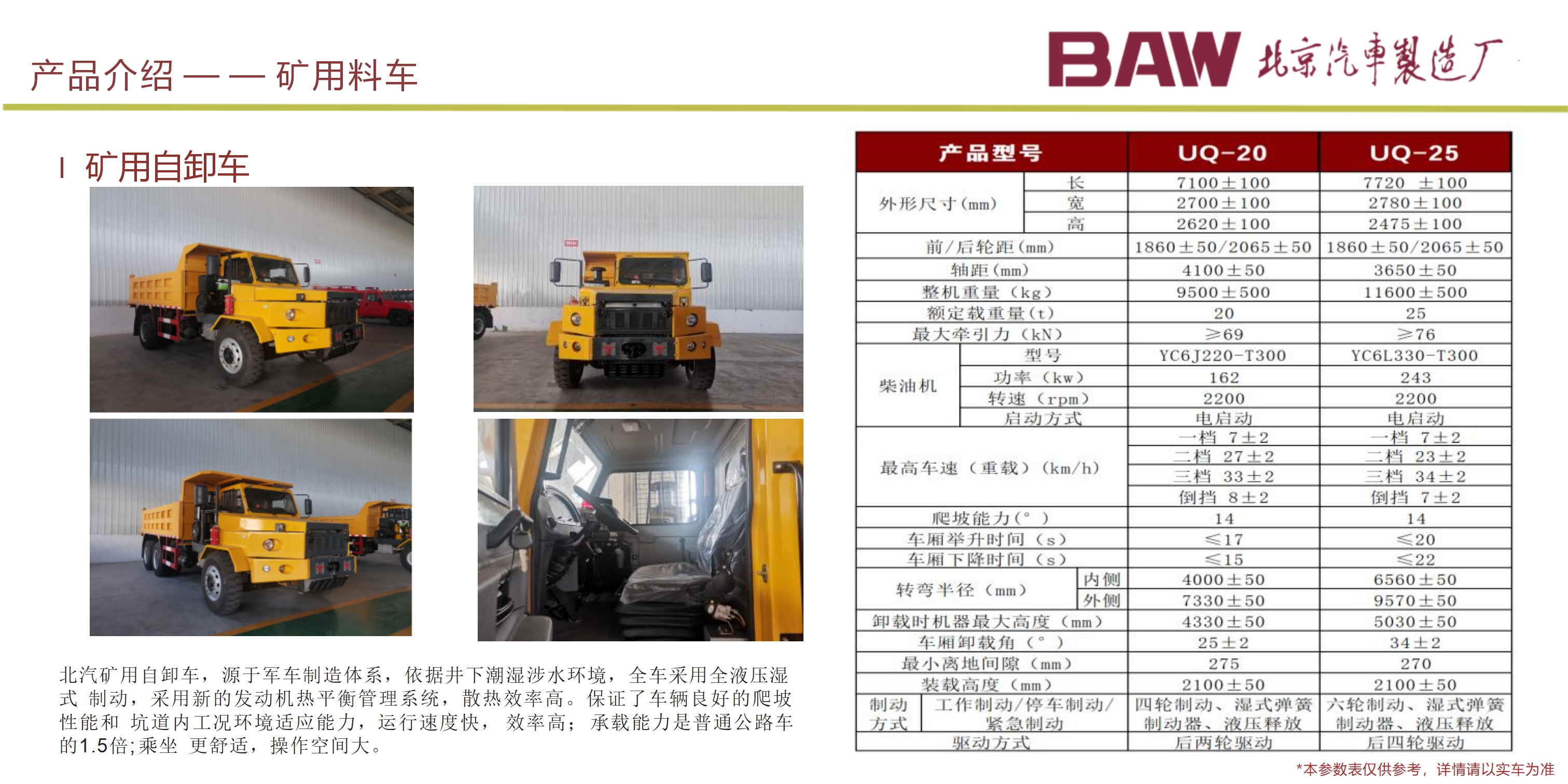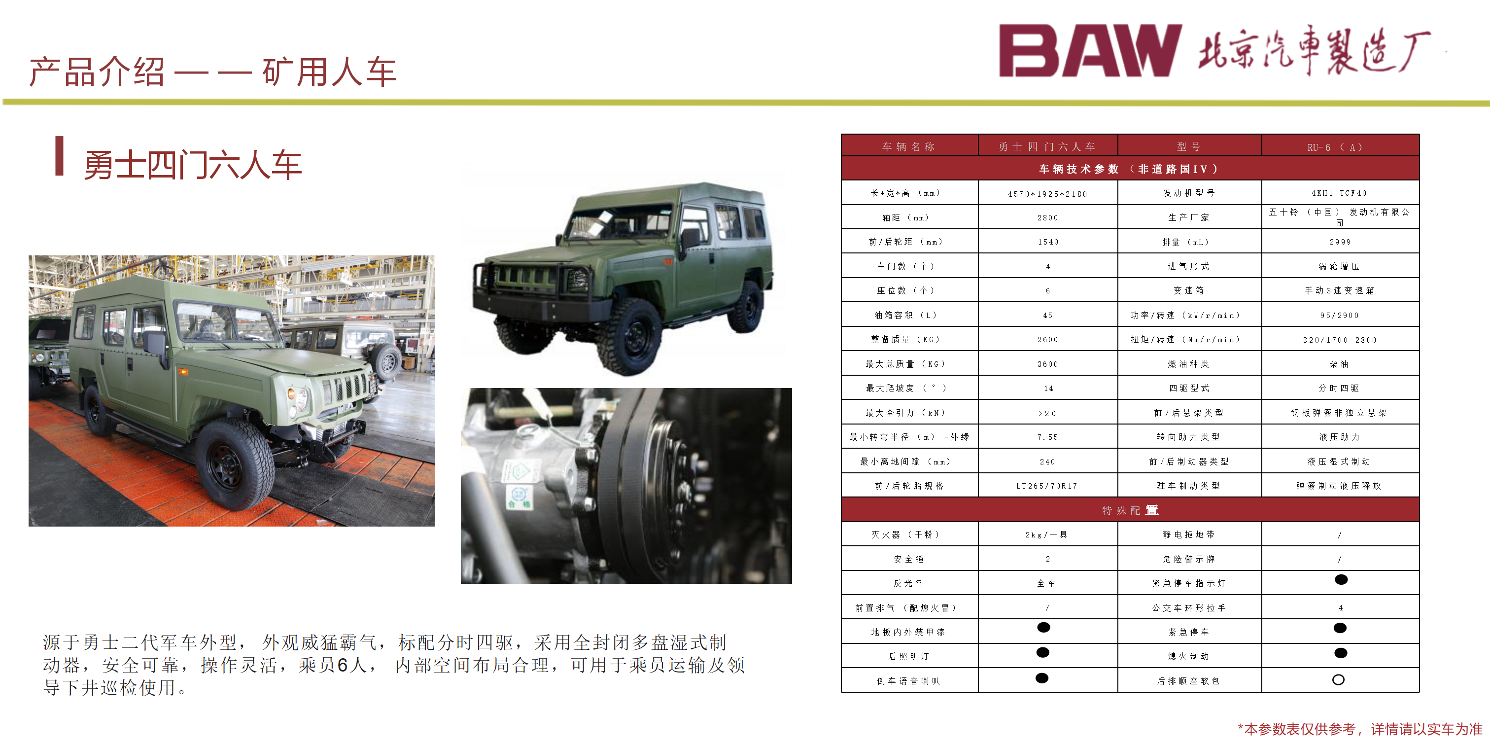 主要用于井下人員的運輸 , 以柴油機為動力,適應能力強; 1、 適用于 3m×3m 巷道斷面的井下運輸作業; 2、整車具有耐碰撞性能高、油耗低、綜合運行成本低、操作簡單,乘座舒 適,結構合理,維修、保養容易等諸多優點; 3、主要電器元件如控制器、液壓、傳動系統的關鍵部件均采用國內外知名 品牌廠家元件,性能可靠; 4、制動系統為濕式制動,彈簧制動,液壓釋放,安全性能更高;